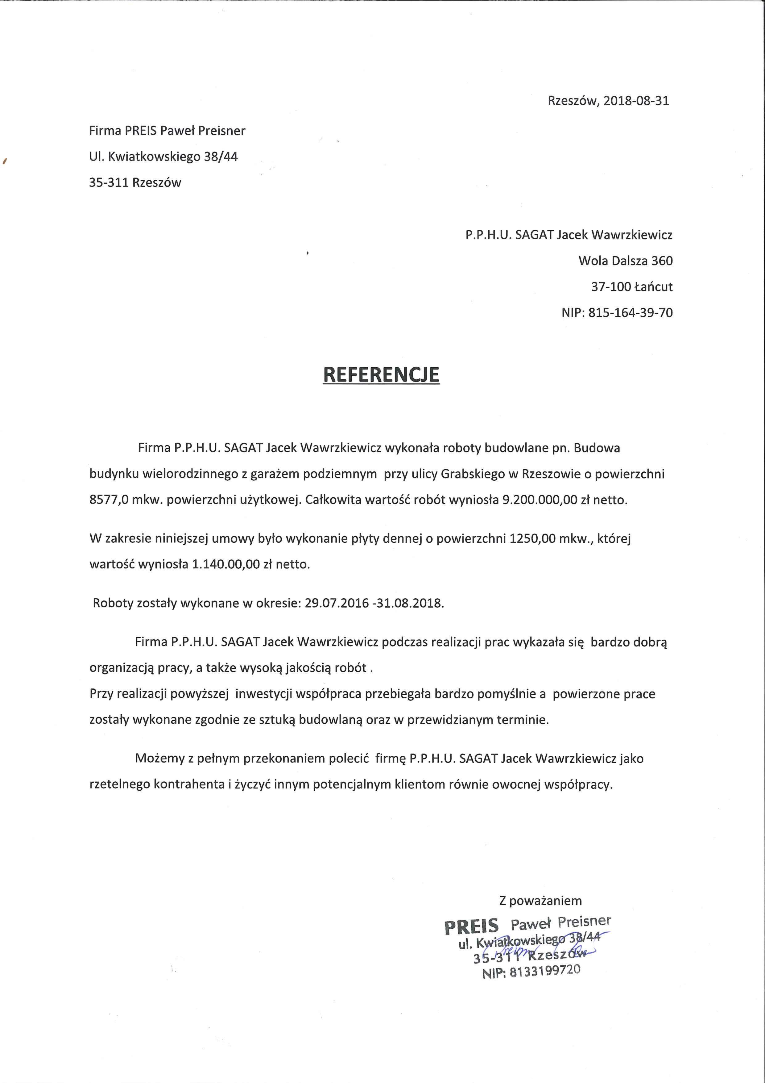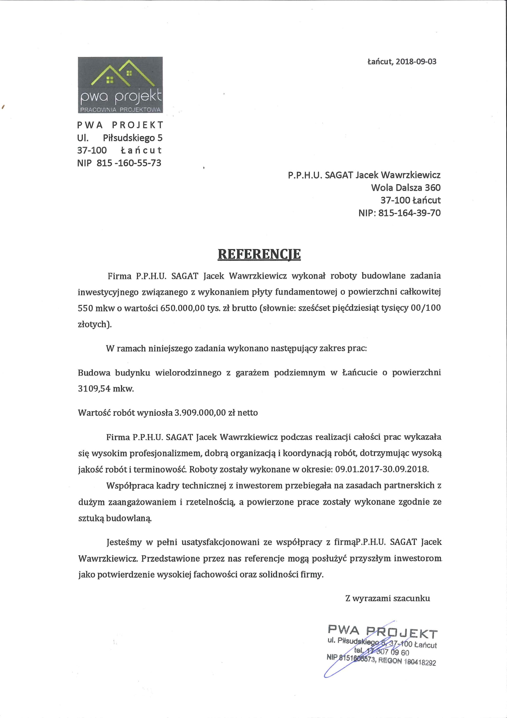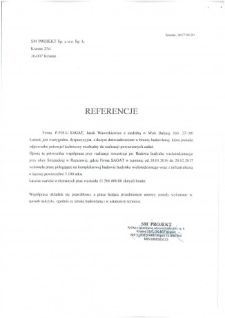 Jesteśmy w pełni usatysfakcjonowani ze współpracy z firmą P.P.H.U. SAGAT Jacek Wawrzkiewicz. Przedstawione przez nas referencje mogą posłużyć przyszłym inwestorom jako potwierdzenie wysokiej fachowości oraz solidności firmy.