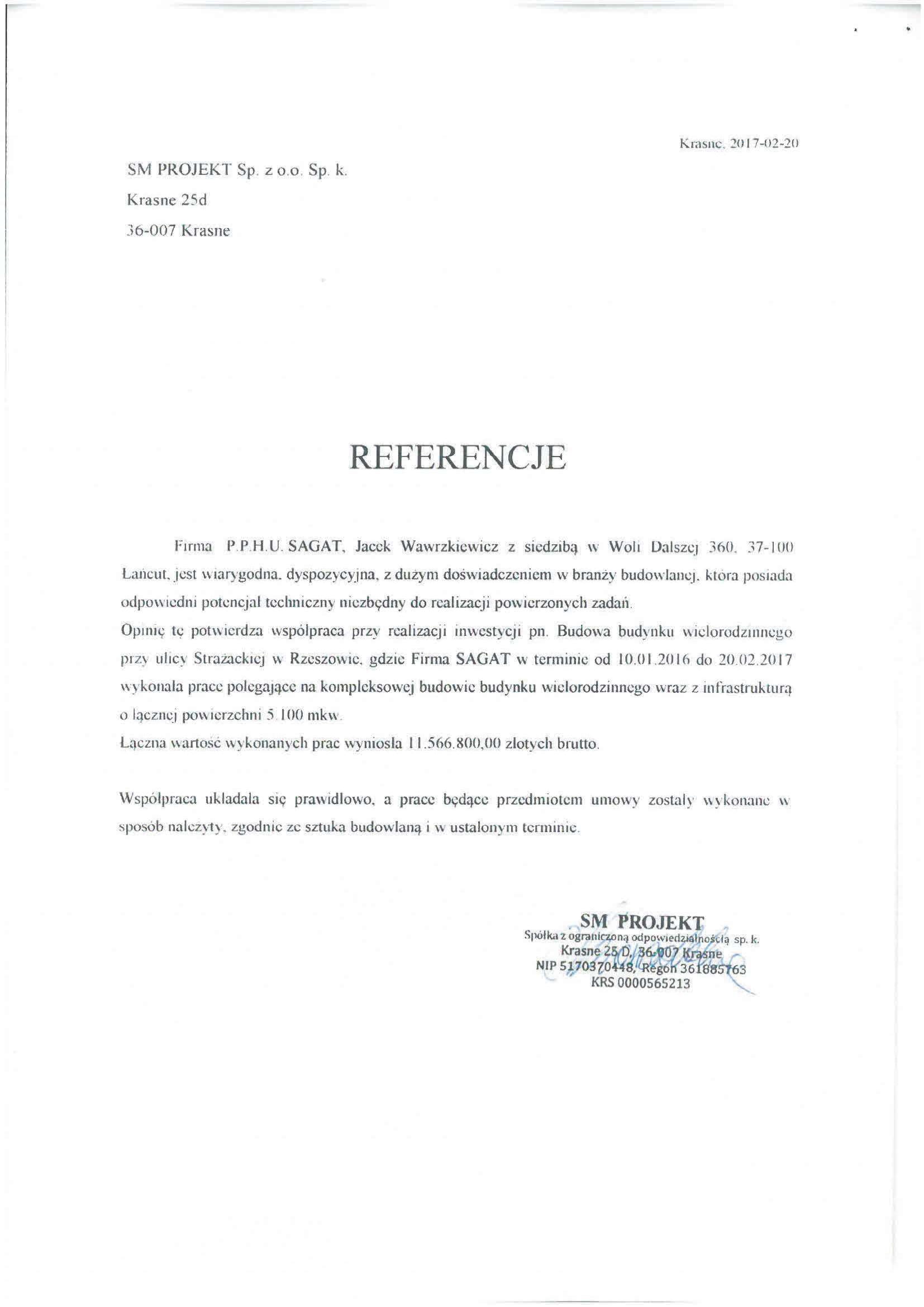 Opinię tę potwierdza współpraca przy realizacji inwestycji pn. Budowa budynku wielorodzinnego przy ul. Strażackiej w Rzeszowie, gdzie firma SAGAT w terminie od 10.01.2016 do 20.02.2017 wykonała prace polegające na kompleksowej budowie budynku wielorodzinnego wraz z infrastrukturą o łącznej powierzchni 5.100 mkw.