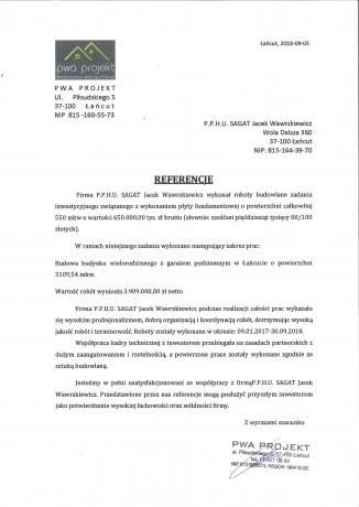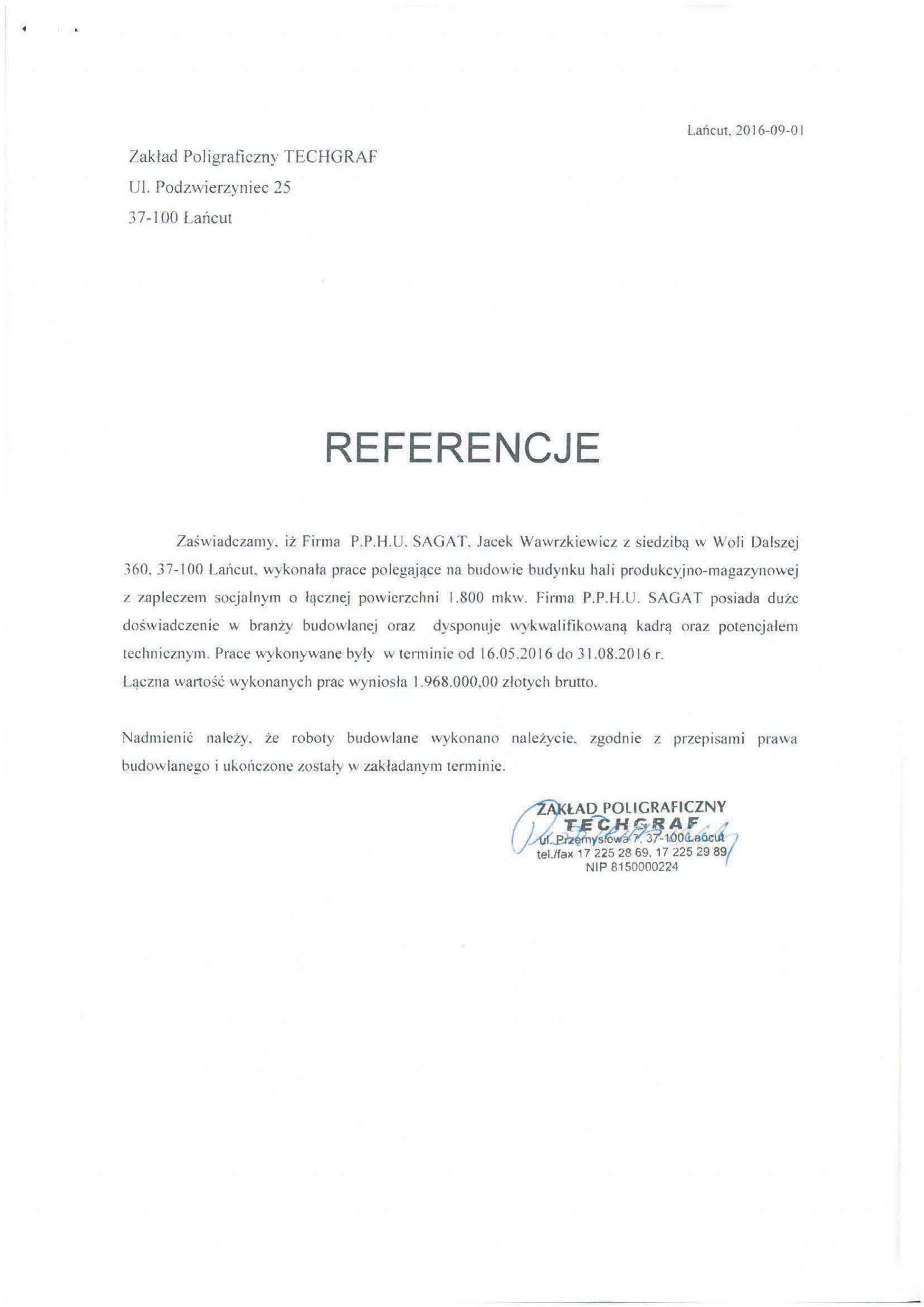 Zaświadczamy, iż Firma P.P.H.U. SAGAT Jacek Wawrzkiewicz z siedziba w Woli Dalszej 360, 37-100 Łańcut, wykonała praca polegające na budowie budynku hali produkcyjno-magazynowej z zapleczem socjalnym o łącznej powierzchni 1.800 mkw. Firma P.P.H.U. SAGAT posiada duże doświadczenie w branży budowlanej oraz dysponuje wykwalifikowaną kadrą oraz potencjałem technicznym. Prace wykonywane były w terminie od 16.05.2016 do 31.08.2016 r.