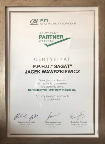 Firma P.P.H.U. SAGAT Jacek Wawrzkiewicz została wyróżniona certyfikatem pt. „Sprawdzony Partner w Biznesie” przez Europejski Fundusz Leasingowy. Ten elitarny tytuł przyznawany jest wyłącznie rzetelnym klientom za wieloletnią współpracę i najwyższą dyscyplinę płatniczą.